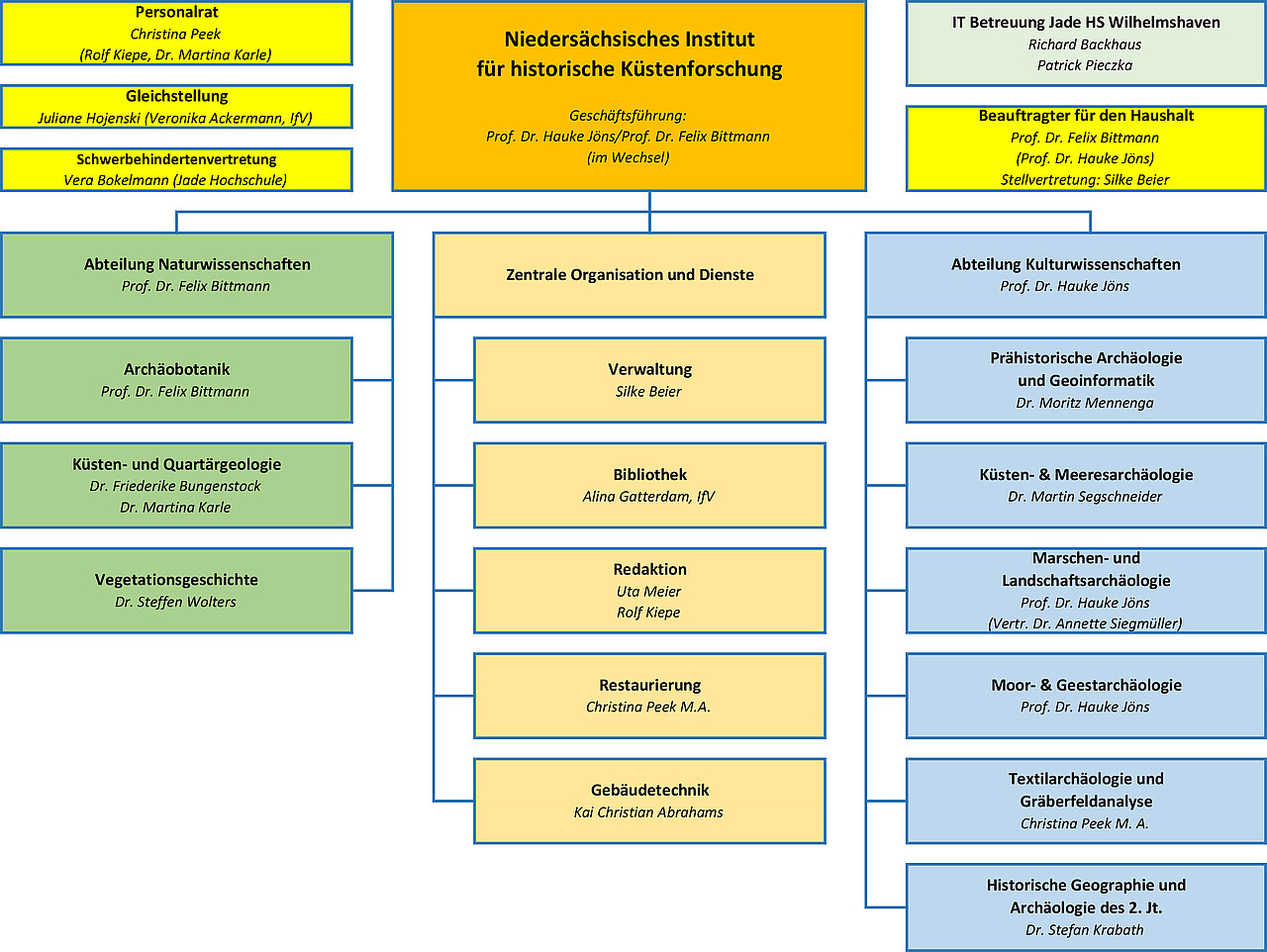 Our broad-based research concept can only be implemented through close interdisciplinary collaboration between the natural and social sciences. These form two departments at the NIhK and shape the work to a great extent. As such, our experts in landscape and settlement archeology, coastal and quaternary geology, soil science, excavation technology, archaeo- / geoinformatics, historical geography, archaeobotany and vegetation history work together closely and across disciplines. As an independent research institution of the State of Lower Saxony, the institute has an extensive library, a restoration facility and building technology as well as an independent administration. In addition, a variety of editorial and layout work is carried out at the NIhK in order to publish the numerous results.