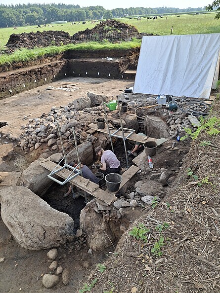 Unter dem Moor im nördlichen Elbe-Weser-Dreieck liegen seit Jahrtausenden Großsteingräber begraben. Sie wurden vor 5000 Jahren von den Menschen der Trichterbecherkultur errichtet, um wenig später von Feuchtgebieten umschlossen und schließlich vollständig übermoort zu werden. Im Gegensatz zu den Fundstellen auf der sandigen Geest sind sie hier vor den modernen Einflüssen des Menschen, aber auch natürlichen Prozessen wie Bodenbildung und Erosion geschützt. Nur wenige Fundstellen dieser Art weisen solche außergewöhnlichen Erhaltungsbedingungen auf. Zu diesen zählen die Fundstellen der Region von Ahlen-Falkenberg im nördlichen Landkreis Cuxhaven, wo sich eine neolithische Landschaft erhalten hat. Im Rahmen des am NIhK angesiedelten Projektes „Relikte im Moor“ konnte diese in den Jahren 2019-2022 umfassend erforscht werden. Es erfolgten neben geomagnetischen Prospektionen, Bohrungen und Ausgrabungen auch bodenkundliche und botanische Analysen, um die einstige Landschaft und deren Entwicklung vom Neolithikum bis in die Eisenzeit auf einer Fläche von fast 1500 ha zu rekonstruieren. An drei Großsteingräbern und einer Siedlung des Mittelneolithikums konnten Sondagen durchgeführt werden, wobei das Fundmaterial eine von Ackerbau- und Viehzucht lebende Gemeinschaft belegt, die Beziehungen zu den Nachbargebieten unterhielten, dabei aber auch klare eigene Traditionen entwickelten. Dies spiegelte sich auch in der Architektur der Großsteingräber wider. Sie bildeten den Startpunkt für das Fortsetzungsprojekt „Zwischen den Flüssen und gegen den Strom“, das sich seit 2025 den gemeinschaftlichen trichterbecherzeitlichen Beziehungen im Elbe-Weser-Dreieck widmet. In diesem Rahmen steht auch das Ahlen-Falkenberger Moor wieder im Fokus, da hier am Großsteingrab Wanna 1591 umfassende Ausgrabungen erfolgen. Hierzu gibt es einen Überblick über die Ergebnisse des ersten Projektes und der Ausgrabung.